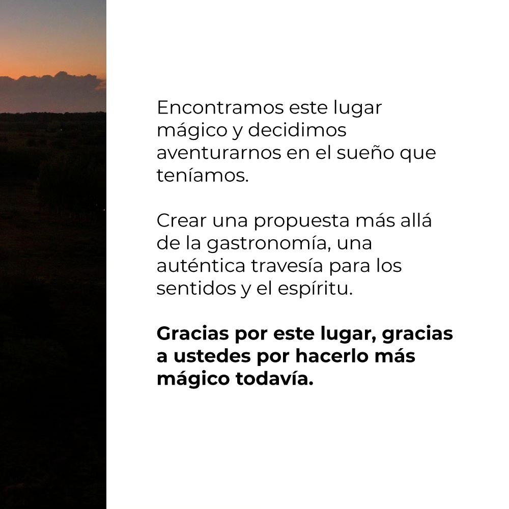 “Un lugar donde la esencia de las playas uruguayas, la naturaleza argentina y nuestra filosofía, se juntan para hacerte vivir el mejor día de tu vida. Donde el encuentro y la conexión con lo que somos se unifican en sentimientos, sabores, olores y música. A sólo 20 minutos de La Plata y a 45 minutos de la Ciudad de Buenos Aires, este lugar brota para hacerte sentir lejos de los ruidos de la ciudad y conectarte con la experiencia del sol, la tierra y el aire. Vení a disfrutar de un lugar alejado de tu rutina pero cerca de tu casa.”